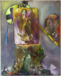 Он использует прием помещения, на первый взгляд, не связанных фрагментов в картину, разделяет на части образы, персонажи и пространство, одновремено объединяет их на одном холсте. Более того, присутствие художника на своем холсте обретает сложный дуализм – художник у мольберта в жизни со своими мыслями и чувствами и мольберт с картиной в пространстве холста или картина внутри картины, как череда фрагментов жизни некоих героев, в свою очередь вызывающих некие реакции, чувства и мысли у зрителя. Благодаря столь сложной конструкции живопись Саши Семёнова становится для зрителя интерактивной незаметно вовлекая его в диалог и с художником и с самим собой. Посредством приема художник-картина-зритель создается ощущение взаимоперетекающего процесса психоанализа.
