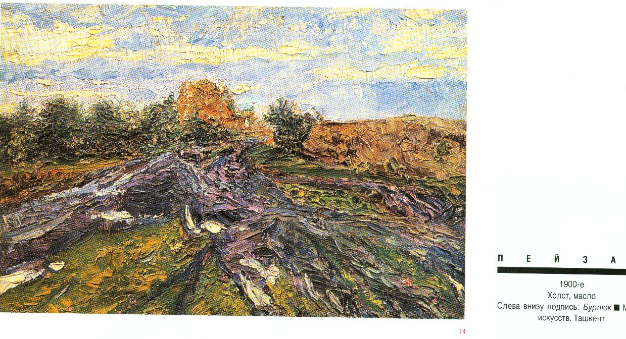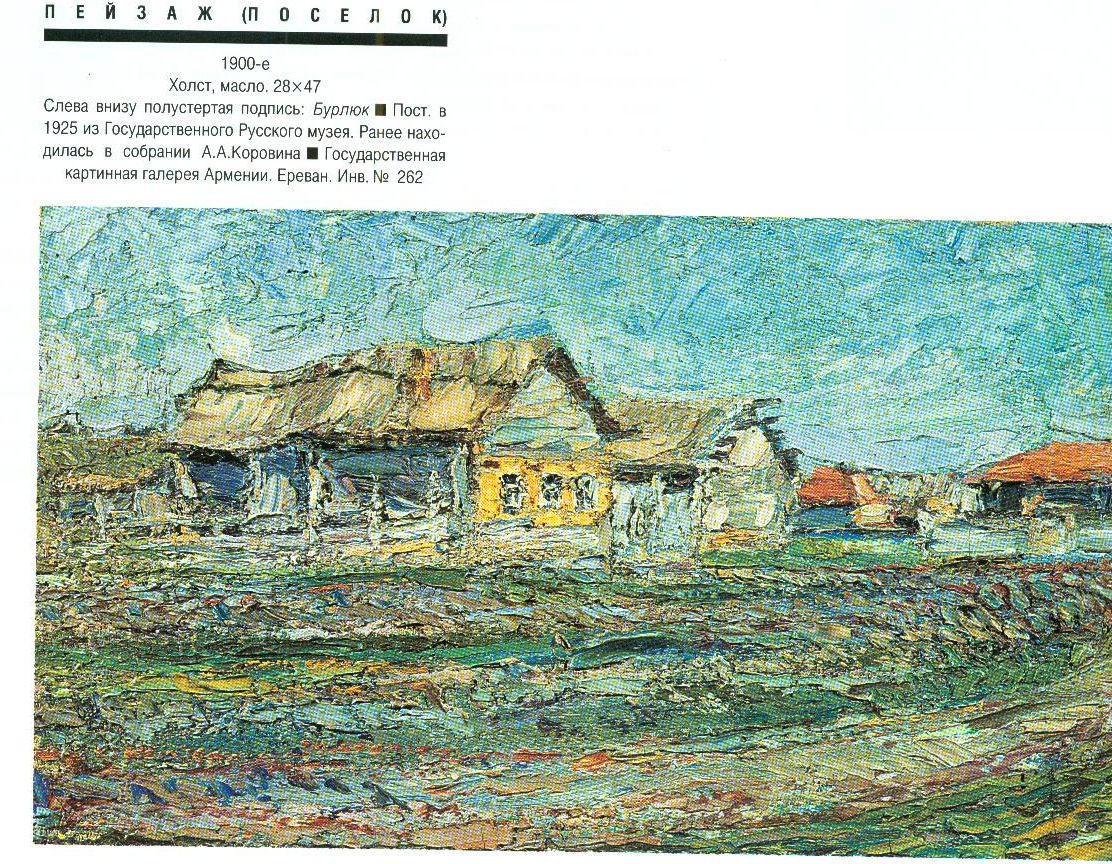 лищах, в Королевской Академии в Мюнхене (1902-1903) у В.Дица, в студии Ф.Кормона в Париже (1904), в МУЖВЗ (с 1911, вместе с В.В.Маяковским исключен в 1914). В эти годы становится одним из ведущих организаторов русского авангардного движения, публикует многочисленные манифесты и воззвания, организует выставки и публичные выступления. В 1908 в Киеве (по случаю выставки «Звена») выпускает свой первый манифест; в 1912 - знаменитую «Пощечину общественному вкусу» (совместно в А.Крученых, В.Маяковским и В.Хлебниковым). В1913—1914 с В.В.Маяковским и В.В.Каменским совершает поездку по России, выступает с лекциями и чтением стихов. В1913 ими же был выпущен фильм «Драма в кабаре № 13». Один из создателей русской футуристической группы «Гилея», иллюстратор и автор многих футуристических изданий («Рыкающий Парнас», «Требник троих», 1913; «Сборник единственных футуристов в мире», 1914), с 1915 - редактор «Первого футуристического журнала», а в 1918 - один из издателей «Газеты футуристов». ■ Член многих объединений (в том числе «Союза молодежи», «Бубнового валета»), участник большинства неакадемических и авангардных выставок второй половины 1900-х - 1910-х (СРХ. СПб., 1906-1907; ТПХВ. 1907-1908; салон «Золотого руна». СПб., 1909; Венок. Москва, 1907-1908; Союз молодежи. СПб., 1911; Треугольник. СПб., 1910; Бубновый валет. Москва, 1912,1913,1916; МТХ. Москва, 1912,1918; Московский салон. Москва, 1913; Синий всадник. Мюнхен, 1912; Мир искусства. Пг., 1915; Выставка живописи. 1915 год. Москва, 1915; Выставка современной русской живописи. Пг., 1916 I других). ■ В1915-1917 живет на Урале, в 1920-1922 - в Японии, с 1922 в США. Обладая недюжинными организаторскими способностями и неуемной внутренней энергией, Бурлюк притягивал талантливых людей и стал центром русского футуристического движения, хотя воплотился в поэзии и живописи менее других. Он прошел период увлечения импрессионизмом (1900-е) и, под влиянием живописи М.Ларионова, пришел к неопримитивизму (начало 1910-х). Это время - наивысший творческий взлет в жизни художника. ■ Литература: Burliuk David. Manifesto. Radio-Style. Universal Camp of Radio-Vodernists. City of USA (New York), 1926 и.д.