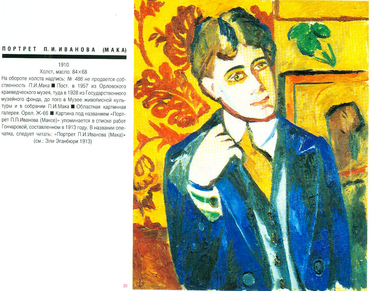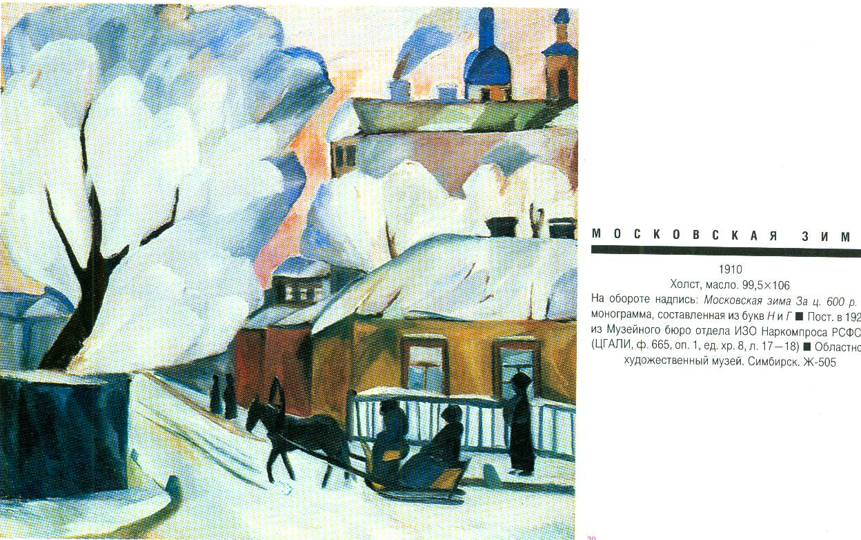 Гончарова Наталья Сергеевна. 4.6.1881, дер. Ладыжино, ныне Тульской области - 7.10.1962, Париж. ■ Училась в МУЖВЗ (1898-1909, сначала в скульптурном классе у П.П.Трубецкого, потом, с 1900, в живописном у К.А.Коровина). Одна из центральных фигур русского предвоенного авангарда. Окало 1900 знакомится с М.Ф.Ларионовым, становится его женой и единомышленником в искусстве. Совместно они не только участвуют во многих выставках (Гончарова - с 1904), но и разрабатывают общие художественные идеи, ■ 1908-1910 - неопримитивистский период, обращение к традициям русского народного искусства, иконам, лубку. В 1910 совместно с М.Ф.Ларионовым и А.В.Лентуловым участвует в создании общества «Бубновый валет». ■ После кубофутуристического периода (1910-1912) вместе с М.ФЛарионовым создает новое художественное направление — лучизм (издают манифест), в котором воплотилась ее любовь к экспрессивной линии и мощному цвету. В живописи и графике этого времени часто сочетаются лучизм и кубофутуризм. Так проиллюстрированы некоторые футуристические книги А.Е.Крученых и Велимира Хлебникова («Мирсконца». М„ 1912; «Взорваль». СПб., 1913; «Играваду». М., 1912; Пустынники. М., 1913). В 1913 снималась в футуристическом фильме «Драма в кабаре № 13». ■ Постоянные контакты с европейским искусством и художниками выразились в участии в лондонских и парижских выставках, и, через посредство В.В.Кандинского, в мюнхенском «Синем всаднике». ■ Работала в области театра. В 1914 оформила «Золотой петушок» Н.А.Римского-Корсакова для С.П.Дягилева, Вместе с М.Ф.Ларионовым покинула Москву, приняв предложение С.П.Дягилева постоянно работать в его антрепризе. После этого становится одним из ведущих художников дягилевских постановок («Испания», постановка М.Равеля, 1916; «Ночь на Лысой горе» М.П.Мусоргского, 1923; «Жар-птица» И.Ф.Стравинского). ■ В1917 окончательно обосновалась вместе с М.Ф.Ларионовым в Париже. Участник выставок: МТХ. .Москва, 1905-1907; Осенний салон. Париж, 1906; три салона «Золотого руна». Москва, 1908-1910; Звено. Киев, 1908; Венок. Москва 1907/08; Венок-Стефанос. СПб.; 1909; Бубновый валет. Москва, 1910; первый 1909/10 и второй 1910/11 салоны В.А.Издебского. Одесса; Союз молодежи. Москва, 1911/12; Ослиный хвост. Москва, 1912; Вторая постимпрессионистическая. Лондон, 1912; Синий всадник. Мюнхен, 1912; Мишень. Москва, 1913; первый немецкий осенний салон. Берлин, 1913; персональная в Художественном салоне на Б.Дмитровке. Москва, 1913 (760 работ); персональная в художественном бюро И.Е.Добычиной. СПб., 1914 (сокращенный вариант); № 4. Москва, 1914; в галерее Поль Гийом. Париж, 1914; Выставка живописи. 1915 год. Москва, 1915; совместная с М.Ф.Ларионовым. Нью-Йорк, 1922; ретроспективная. Париж, 1948 и 1956; ретроспективная (совместно с М.Ф.Ларионовым). Лондон, 1961. ■ Литература: Выставка картин Н.С.Гончаровой. 1900-1913. М., 1913; ЭганбюриЭ. Наталия Гончарова, Михаил Ларионов. М., 1913 (со списком произведений); Тугенцхопьц Я. Выставка картин Наталии Гончаровой. - Аполлон, 1913, № 8; Овсянникова Е. Книжная графика Натальи Гончаровой,- Искусство, 1989, №8, с. 68-72.