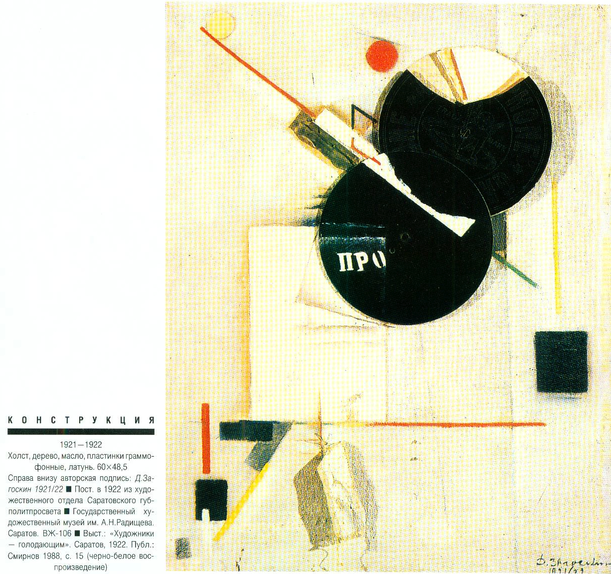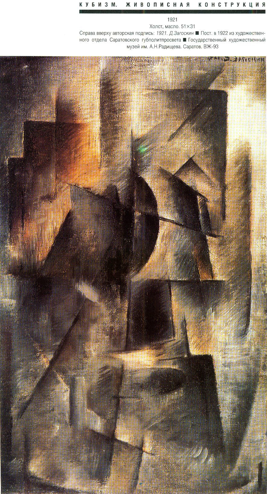 Загоскин Давид Ефимович. 2.2.1900, Сураж Витебской губернии - 2.2.1942, Ленинград. ■ Учился в 1916-1917 в Одесской школе, в 1918-1920 в Саратовском высшем художественно-техническом институте (ГСХМ) у Ф.Ф.Константинова. Там же преподавал и сам в 1920-1922. В дальнейшем вел преподавательскую деятельность в Москве V Ленинграде. ■ Участник выставок с 1919. Члек правления федерации «левых» художников. Член объединения«Круг художников» (1926-1932). ■ Был связан с авангардным искусством лишь во время учебы и преподавания в ГСХМ. Работал тогда в традиционном для второго послереволюционного поколения русских авангардистов стиле, соединившее в себе черты кубофутуризма и конструктивизма.