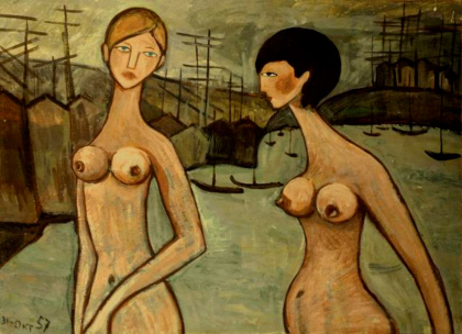 Художник КРОПИВНИЦКИЙ ЕВГЕНИЙ ЛЕОНИДОВИЧ,"Девушки у воды", 1957 г., картон, м.,48х63,8см. Собрание Л.Кропивницкого. р.50х36с.
