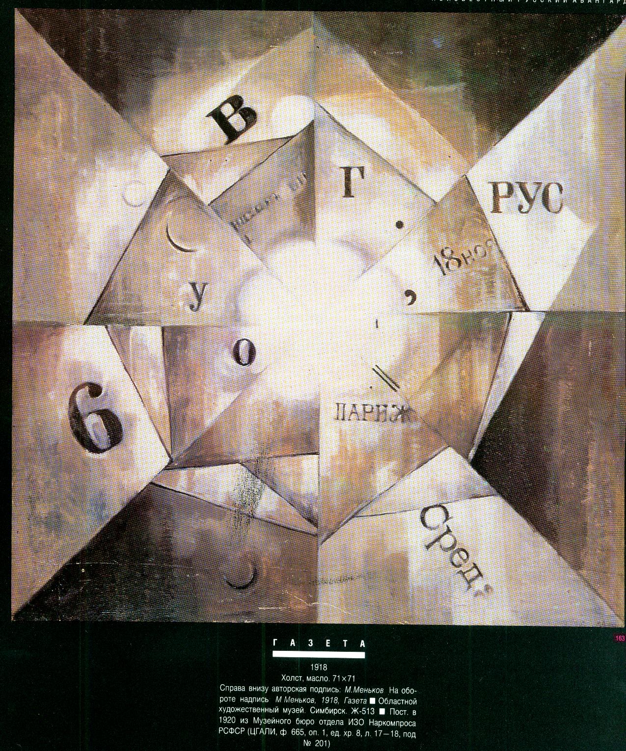 Меньков Михаил Иванович. 15.9.1885, Вильна - после 1921. Окончил Двинское реальное училище. В 1912 поступил в МУЖВЗ на скульптурное отделение, позже перевелся на архитектурное. Ушел из училища по собственному желанию в октябре-ноябре 1914. В 1914 – 1915 живет в Остроге Волынской губернии, поступает в 1915 в военное училище (в связи с мобилизацией). ■ Видимо, во время учебы в МУЖВЗ познакомился с К.С. Малевичем и оказался под его сильным влиянием. Участвовал с К.С. Малевичем на выставках. Выпустил два манифеста (1915,1919), в которых призывал к эмоциональному восприятию живописи. ■ В1921 писал А.М. Родченко в отдел ИЗО из Ялты: «<...> куда направить последние из моих вещей, находящихся при мне? Я очень болен и нахожусь в данное время в санатории». ■ Участник выставок: 0,10. Петроград, 1915; Бубновый валет. Москва, 1917; 1-я выставка картин профессионального союза художников Москвы. Москва, 1918; 8-я (без жюри) и 10-я («Беспредметное творчество и супрематизм») Государственные выставки. Москва, 1919; III выставка картин. Рязань, 1919. ■ Последователь К.С. Малевича и один из адептов супрематизма.