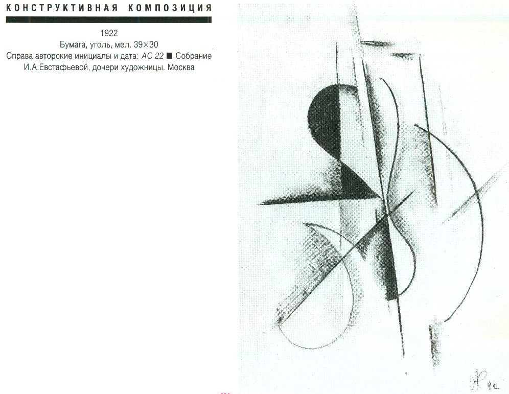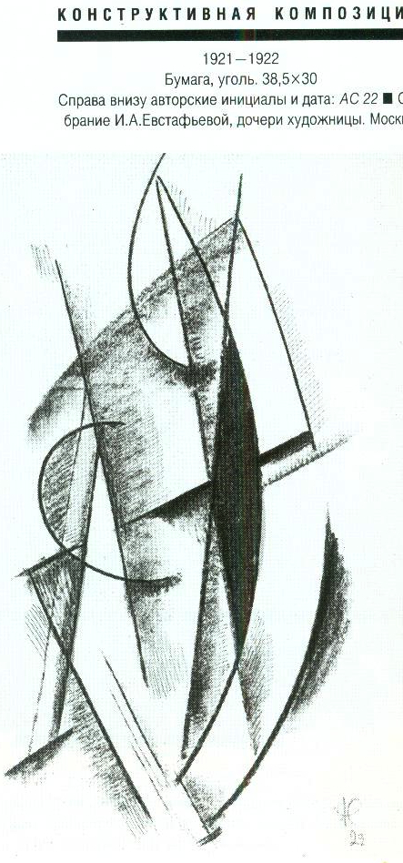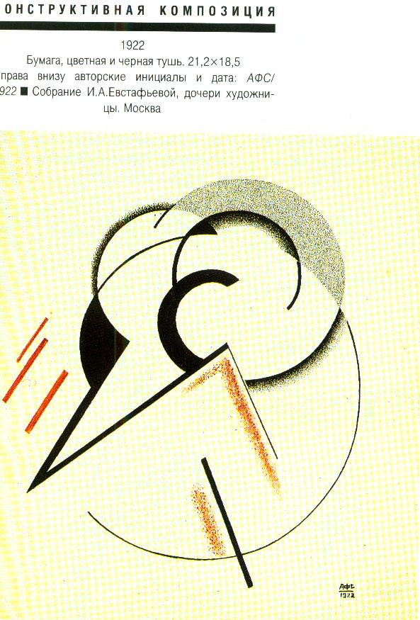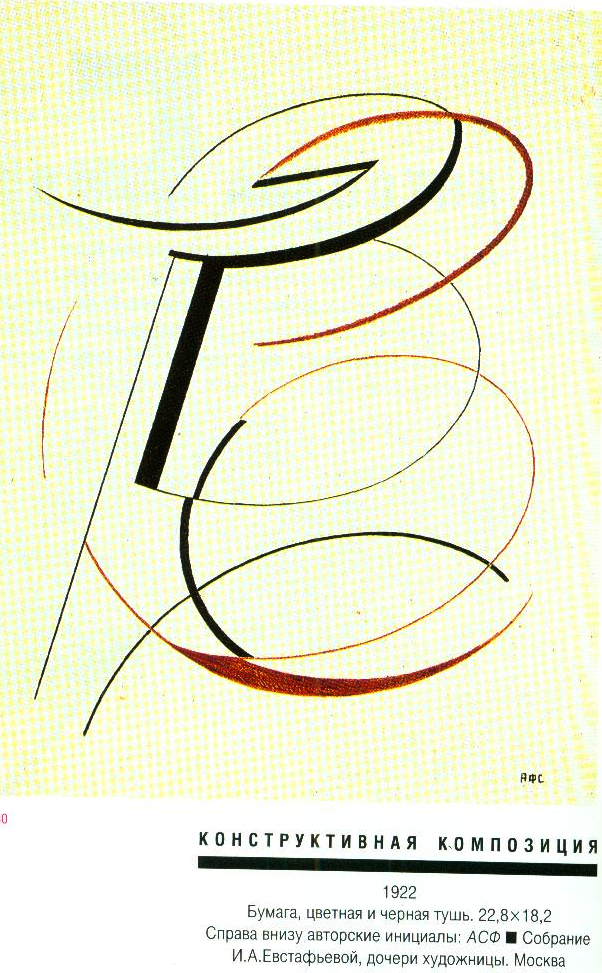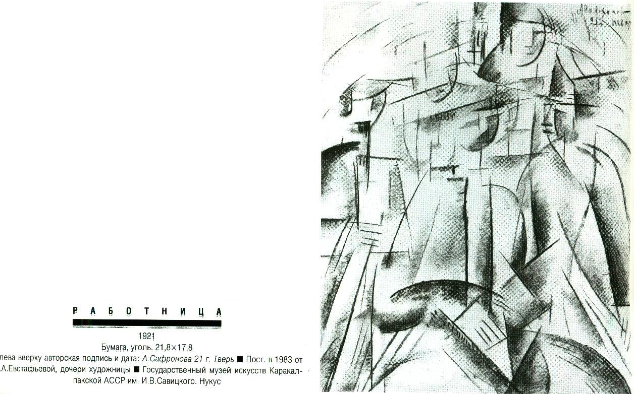 В 1920-1921 живет в Твери, где преподает живопись в ГСХМ (вместе с М. К. Соколовым). ■ В 1921 переезжает в Москву, где станвоится инструктором ИЗО Политуправления Московского военного округа, а в 1922 - руководителем ИЗО московского Пролеткульта. ■ Участник выставок: Бубновый валет. Москва, 1914; Московские художники в пользу раненых. Москва, 1916; МТХ. Москва, 1917; Мир искусства. Москва, 1917; 5-я Государственная выставка картин. Москва, 1919; группы «13». Москва, 1929 и другие. ■ Увлечение беспредметным искусством было лишь небольшим эпизодом (начало 1920-х) в творческой биографии А.Ф.Софроновои. Произошло это, вероятно, не без влияния известного искусствоведа Н.М.Тарабукина, читавшего в Твери лекции по истории и теории искусства в начале 1920-х. Художница была автором обложки книги Н.М.Тарабукина «От мольберта к машине» (М., 1923). ■ Литература: Немировская МЛ. Работы А.Ф.Софроновои в Третьяковской галерее. - В кн.: Музей 1. М., 1980, с. 19-22.